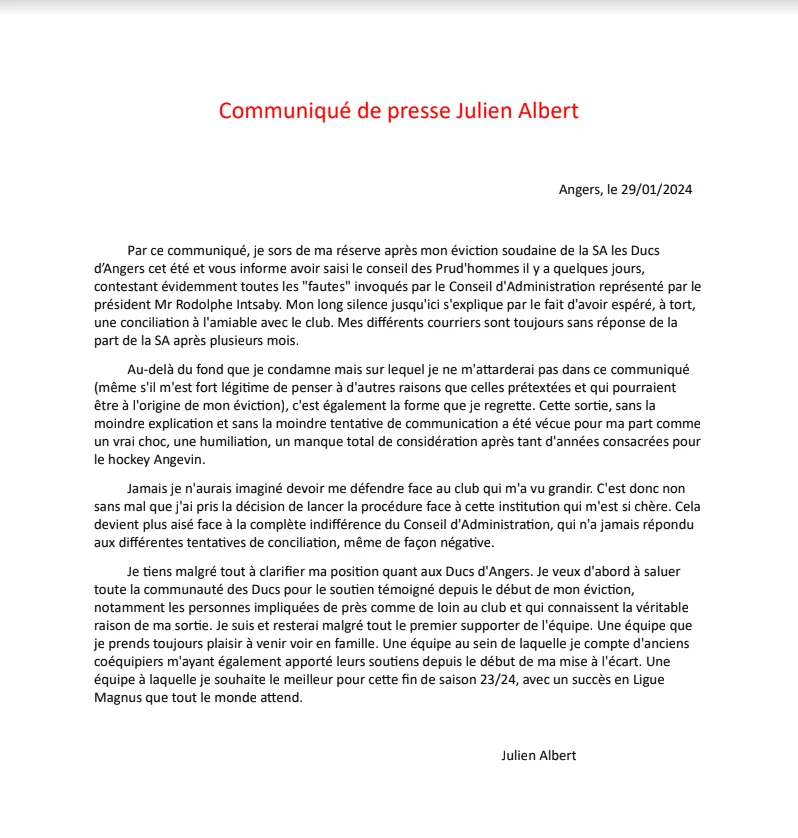 Ce mardi 30 janvier, Julien Albert, resté discret à ce sujet depuis son départ du club, a partagé un communiqué d’une page dans lequel il souhaite exposer sa version des faits. Il « conteste évidemment les “fautes” invoquées par le Conseil d’Administration » et dit regretter le fond et la forme de ce licenciement. « Jamais je n'aurais imaginé devoir me défendre face au club qui m'a vu grandir. [...] Cela devient plus aisé face à la complète indifférence du Conseil d'Administration, qui n'a jamais répondu aux différentes tentatives de conciliation, même de façon négative. »