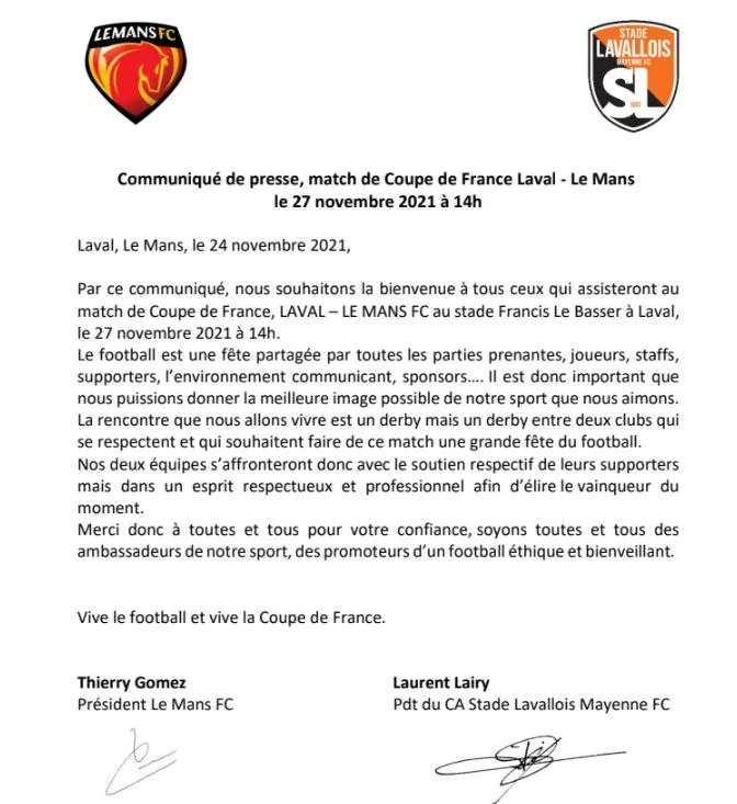 Le président du Stade lavallois, Laurent Lairy, a signé un communiqué avec son homologue du Mans, Thierry Gomez. Ils demandent de "donner la meilleure image possible" lors du derby samedi (14 h).